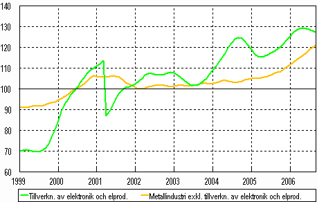 Trenden för industriproduktionen 1999-2006, september (Elektronikindustri och övrig metallindustri), 2000=100