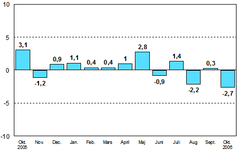 I oktober 2006 var den säsongrensade industriproduktionen enligt Statistikcentralen 2,7 procent mindre än i september. Den säsongrensade industriproduktionsvolymen ökade i oktober med 1,2 procent jämfört med oktober år 2005.