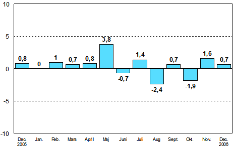 I december 2006 var den säsongrensade industriproduktionen enligt Statistikcentralen 0,7 procent större än i november. Den säsongrensade industriproduktionsvolymen ökade i december med 5,8 procent jämfört med december år 2005. Enligt Statistikcentralens preliminära uppgifter ökade industriproduktionen år 2006 med 7,8 procent.