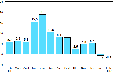 I februari 2007 var den säsongrensade industriproduktionen enligt Statistikcentralen 0,1 procent mindre än i februari 2006. Ökningen av industriproduktionen fortgick hela år 2006, men stannade upp i januari.