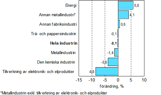 Produktionen sjönk i februari inom flera huvudnäringsgrenar. Mest sjönk tillverkningen av elektronik och elprodukter, med drygt 8 procent. Produktionen inom den kemiska industrin minskade med något under 4 procent. Produktionen inom metallindustrin minskade med drygt en procent. Däremot fortsatte ökningen inom energiförsörjningen också i februari. Ökningen var nästan 6 procent.