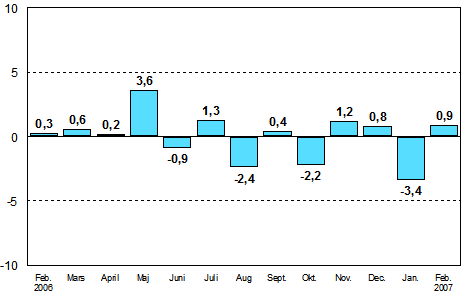 I februari 2007 var den säsongrensade industriproduktionen enligt Statistikcentralen 0,9 procent större än i januari.