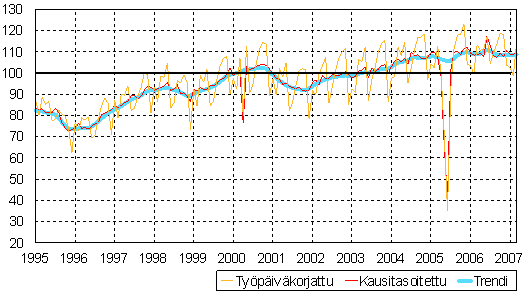 teollisuustuotannon volyymi-indeksi 1995 - 2007 maaliskuu,