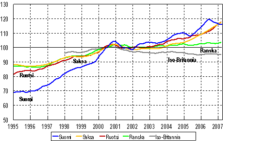 Teollisuustuotannon trendi TOL C,D,E, Suomi, Saksa, Ruotsi, Ranska ja Iso-Britannia 1995 - 2007, 2000=100