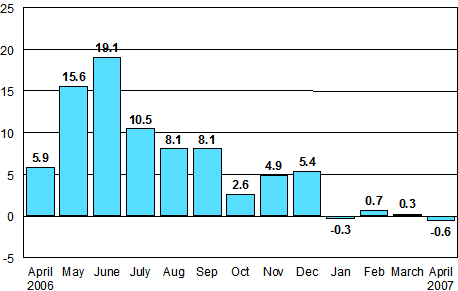 Seasonally adjusted change in industrial output 4/2006-4/2007, %