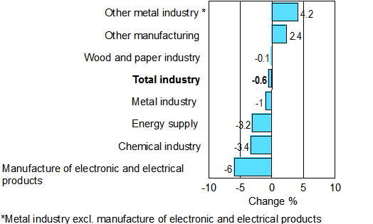 Output fell in several main industries in April. The largest decrease of 6 per cent was recorded in the manufacture of electrical and electronic products. In the chemical industry, output decreased by a good 3 per cent. In April, growth industries included other metal industry, which grew by a good 4 per cent, and other manufacturing, where output was a good two per cent higher than one year previously.