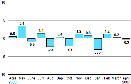 According to Statistics Finland, seasonally adjusted industrial output was 0.3 per cent lower in April 2007 than in March.