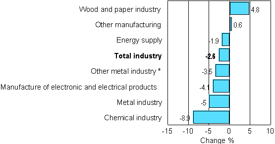 Output fell in several main industries in May. In the manufacture of chemicals the decrease in output amounted to 8.9 per cent. Output diminished by 5 per cent in the metal industry and by 4.1 per cent in the manufacture of electrical and electronic products. In May, growth industries included the wood and paper industry, where output grew by 4.8 per cent, and other manufacturing, where growth from twelve months back amounted to 0.6 per cent.