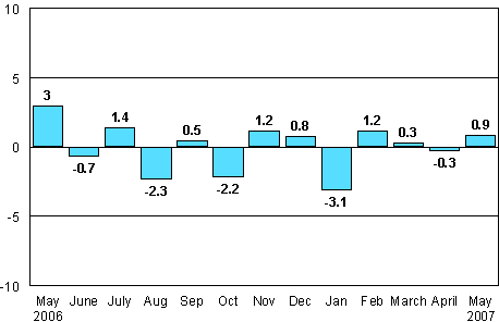 According to Statistics Finland, seasonally adjusted industrial output was 0.9 per cent higher in May 2007 than in April.