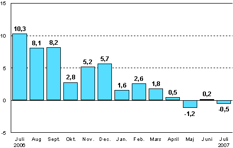 I juli 2007 var den säsongrensade industriproduktionen enligt Statistikcentralen 0,6 procent större än i juni.