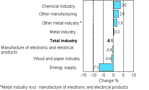 According to Statistics Finland's preliminary data, industrial output grew in several main industries in August 2007 when compared with the previous year. Output in manufacturing was 1.2 per cent up from the year before. The highest growth was recorded in chemical industry, other manufacturing and other metal industry. However, total industrial output in August was on level with August 2006. Output decreased by a good 7 per cent in energy supply. Peat production contracted by over 70 per cent as a result of the rainy August.