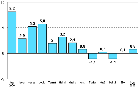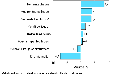 Teollisuuden kausitasoitettu tuotanto oli Tilastokeskuksen mukaan vuoden 2007 syyskuussa 0,8 prosenttia suurempi kuin vuotta aikaisemmin. Teollisuustuotanto kasvoi syyskuussa 2007 useilla päätoimialoilla verrattuna edelliseen vuoteen. Tehdasteollisuuden tuotanto oli 2,3 prosenttia viime vuotta suurempi. Toimialoista kasvoivat eniten kemianteollisuus, muu tehdasteollisuus sekä muu metalliteollisuus. Mineraalien kaivu väheni lähes 40 prosenttia. Energiahuollon toimialalla tuotanto väheni runsaat 7 prosenttia.