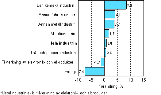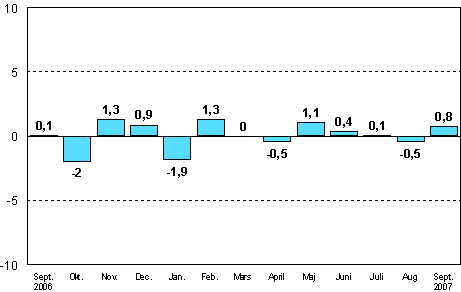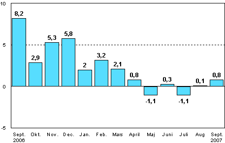 I september 2007 var den säsongrensade industriproduktionen enligt Statistikcentralen 0,8 procent större än i september 2006. Industriproduktionen ökade i september 2007 inom flera huvudnäringsgrenar jämfört med året innan. Produktionen inom fabriksindustrin var 2,3 procent större än året innan. Av näringsgrenarna var ökningen störst inom den kemiska industrin, övrig fabriksindustri och övrig metallindustri. Utvinning av mineral minskade med nästan 40 procent. Inom energiförsörjningen minskade produktionen med drygt 7 procent.