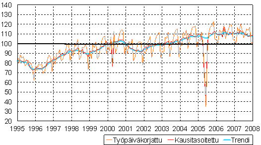 teollisuustuotannon volyymi-indeksi 1995 - 2008 tammikuu,