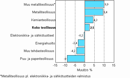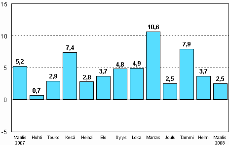 Teollisuuden työpäiväkorjattu tuotanto oli Tilastokeskuksen mukaan vuoden 2008 maaliskuussa 2,5 prosenttia suurempi kuin vuotta aikaisemmin. Muu metalliteollisuus kasvoi maaliskuussa eniten. Sen tuotanto kasvoi 9,9 prosenttia. Kemianteollisuuden tuotanto kasvoi 4,3 prosenttia. Elektroniikka ja sähkötuotteiden valmistus väheni maaliskuussa 0,3 prosenttia. Muun tehdasteollisuuden tuotanto väheni 4,2 prosenttia. Eniten väheni puu- ja paperiteollisuuden tuotanto, 9 prosenttia.