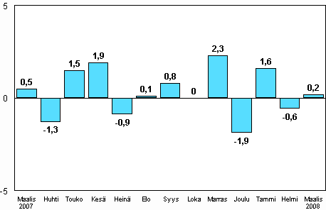 - Teollisuustuotannon kausitasoitettu muutosprosentti helmikuu 2008 / maaliskuu 2008 (30.4.2008)