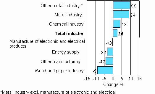 According to Statistics Finland, industrial output adjusted for working days was 2.5 per cent higher in March 2008 than twelve months earlier. In March, output grew most in other metal industry where it went up by 9.9 per cent. In the chemical industry, output increased by 4.3 per cent. The manufacture of electrical and electronic products declined by 0.3 per cent in March. In other manufacturing output fell by 4.2 per cent. Output declined most, or by 9 per cent, in the wood and paper industry.