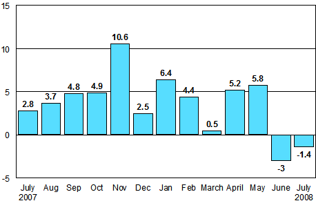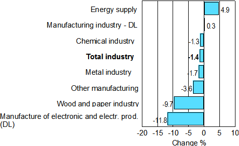 According to Statistics Finland, industrial output adjusted for working days was 1.4 per cent lower in July 2008 than twelve months earlier. In the January to July period, industrial output adjusted for working days grew by 2.4 per cent from twelve months back. The prolonged growth in industrial output stalled. Of the main industries, growth was observed only in energy supply. The manufacture of electrical and electronic products declined by 11.8 per cent in July. Output in the wood and paper industry decreased by 9.7 per cent and in other manufacturing by 3.6 per cent in July. In the chemical industry, output decreased by 1.3 per cent in July.