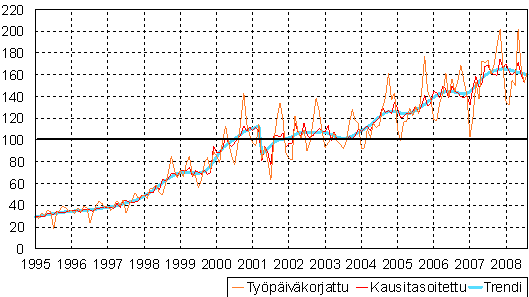 teollisuustuotannon volyymi-indeksi 1995 - 2008 elokuu,
