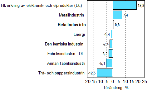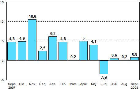 Enligt Statistikcentralen var den arbetsdagskorrigerade industriproduktionen 0,8 procent större i september 2008 än året innan. Den arbetsdagskorrigerade industriproduktionen ökade under januari-september med 1,9 procent från året innan. Jämfört med motsvarande period året innan har ökningen avtagit med nästan två procentenheter. Av de huvudsakliga näringsgrenarna ökade tillverkningen av elektronik och elprodukter mest i september, med närmare 19 procent. Däremot minskade fabriksindustrin exkl. tillverkning av elektronik- och elprodukter med drygt 3 procent. Tillväxten inom elektronikindustrin drog med hela produktionen inom metallindustrin till en tillväxt på drygt 7 procent. Mest minskade produktionen inom trä- och pappersindustrin, dvs. med 12,5 procent. Produktionen inom den övriga fabriksindustrin sjönk med 5,1 procent. Inom den kemiska industrin minskade produktionen i september med 2,4 procent.