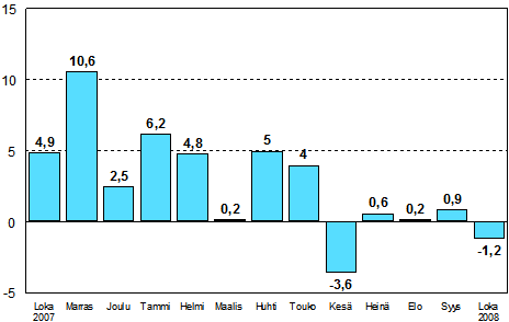 Teollisuuden työpäiväkorjattu tuotanto oli Tilastokeskuksen mukaan vuoden 2008 lokakuussa 1,2 prosenttia pienempi kuin vuotta aikaisemmin. Tammi-lokakuussa työpäiväkorjattu teollisuustuotanto kasvoi 1,5 prosenttia vuoden takaisesta. Viime vuoden vastaavasta ajankohdasta kasvuvauhti on hidastunut runsaat kaksi prosenttiyksikköä. Lokakuussa päätoimialoista kasvoi eniten elektroniikka- ja sähkötuotteiden valmistus, runsaat 6 prosenttia. Sen sijaan tehdasteollisuus ilman elektroniikka- ja sähkötuotteiden valmistusta väheni runsaat 3 prosenttia. Elektroniikkateollisuuden kasvu veti koko metalliteollisuuden tuotannon vajaan 2 prosentin kasvuun. Kemianteollisuuden tuotanto kasvoi lokakuussa runsaat 2 prosenttia. Eniten väheni puu- ja paperiteollisuuden tuotanto lähes 11 prosenttia. Muun tehdasteollisuuden tuotanto laski 3,8 prosenttia.