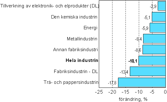 I november sjönk produktionen inom alla huvudnäringsgrenar. Ännu i oktober ökade metallindustrin med nästan 2 procent från året innan. I november sjönk produktionen inom metallindustrin med drygt 8 procent. Mest sjönk produktionen inom trä- och pappersindustrin, med nästan 18 procent.