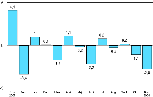 Enligt Statistikcentralen var den arbetsdagskorrigerade industriproduktionen 10,1 procent mindre i november 2008 än året innan. Den arbetsdagskorrigerade industriproduktionen ökade under januari-november med bara 0,3 procent från året innan. Jämfört med motsvarande period året innan har ökningen avtagit med drygt fyra procentenheter.
