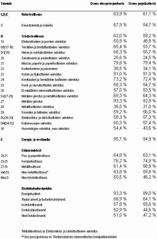 Teollisuustuotannon volyymi-indeksin peittävyys otosperusjoukon bruttoarvosta oli koko teollisuuden tasolla (TOL CDE) 64 prosenttia. Bruttoarvopeittävyys vaihtelee vajaasta 30 prosentista (sahatavaran ja puutuotteiden valmistus) runsaaseen 93 prosenttiin (metallien jalostus). Alla olevassa taulukossa on myös teollisuustuotannon volyymi-indeksin peittävyys populaatiosta. Populaationa ovat Suomessa toimivat teolliset toimipaikat.