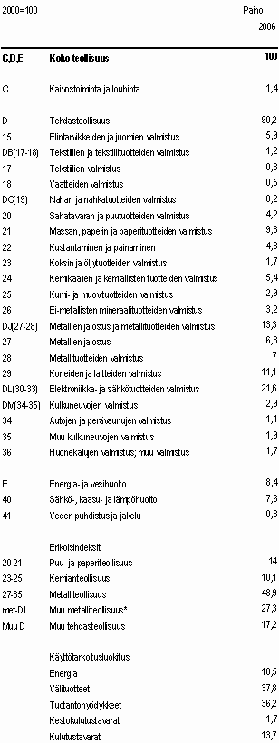 Ohessa teollisuustuotannon volyymi-indeksin julkaisutoimialat ja jalostusarvo-osuudet. Toimialoittaisina painoina käytetään vuonna 2008 vuoden 2006 jalostusarvo-osuuksia.