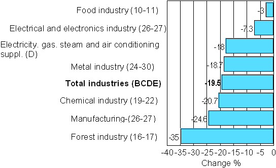 Output fell in all main industries in January. The decline in output steepened when compared with December. In January the metal industry's output fell by nearly 19 per cent. Output fell most in the forest industry, by 35 per cent.