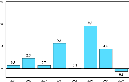 Teollisuustuotanto väheni vuoden 2008 ennakkotietojen mukaan 0,7 prosenttia. Vuonna 2007 teollisuustuotanto kasvoi 4,4 prosenttia.