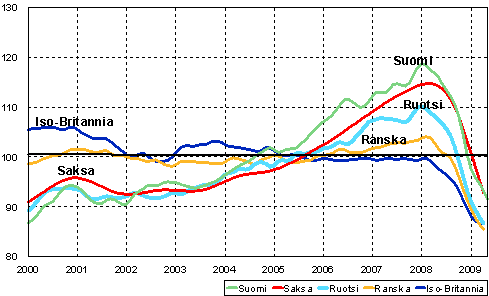 Teollisuustuotannon trendi Suomi (BCDE), Saksa, Ruotsi, Ranska ja Iso-Britannia (BCD) 2000 - 2009, 2005=100, TOL 2008