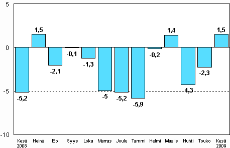 - Teollisuustuotannon kausitasoitettu muutosprosentti toukokuu 2009 / kesäkuu 2009, TOL 2008 (10.8.2009)