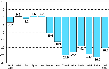 Koko teollisuuden (BCDE) työpäiväkorjattu tuotanto oli Tilastokeskuksen mukaan vuoden 2009 kesäkuussa 20,3 prosenttia pienempi kuin vuotta aikaisemmin. Toukokuussa teollisuustuotanto väheni 26,3 prosenttia vuoden takaisesta. Tammi-kesäkuussa teollisuustuotanto on vähentynyt 23 prosenttia viime vuoden vastaavasta ajankohdasta.