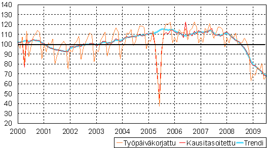 teollisuustuotannon volyymi-indeksi 2000 - 2009 heinäkuu, 2005=100,