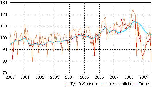 teollisuustuotannon volyymi-indeksi 2000 - 2009 heinäkuu, 2005=100,