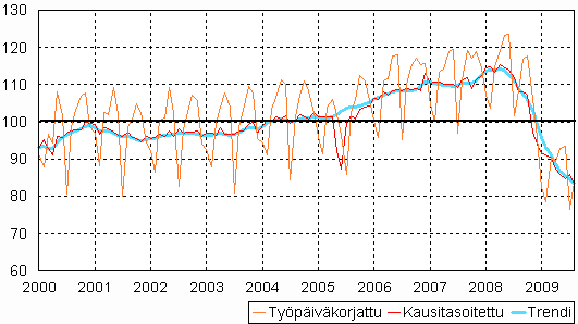 teollisuustuotannon volyymi-indeksi 2000 - 2009 elokuu, 2005=100,