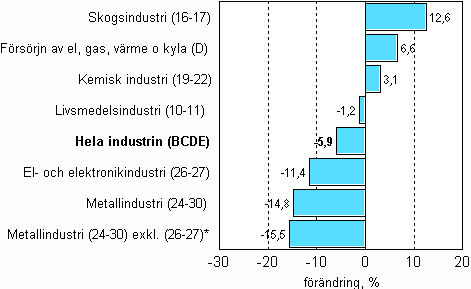 Jämfört med året innan sjönk produktionen ytterligare inom flera huvudnäringsgrenar. Mest sjönk produktionen inom övrig metallindustri, med 15,5 procent. Inom el- och elektronikindustrin minskade produktionen med 11,4 procent. Inom livsmedelsindustrin var produktionen drygt en procent mindre än året innan. Mest ökade skogsindustrin, 12,6 procent. Inom skogsindustrin ökade produktionen jämfört med året innan för första gången på mer än två år. Också produktionen inom el och värme samt den kemiska industrin ökade från året innan.