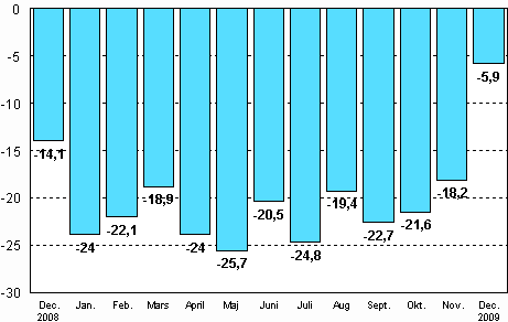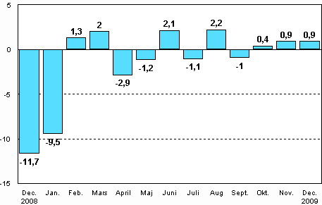 Enligt Statistikcentralen var den arbetsdagskorrigerade produktionen för hela industrin 5,9 procent mindre i december 2009 än året innan. Den säsongrensade produktionen var ändå 0,9 procent större än i november. Produktionen har nu ökat tre månader i följd jämfört med föregående månad. I fjol var industriproduktionen 20,9 procent mindre än år 2008 och produktionen var på samma nivå som år 2000. Nedgången var den kraftigaste under självständighetstiden.