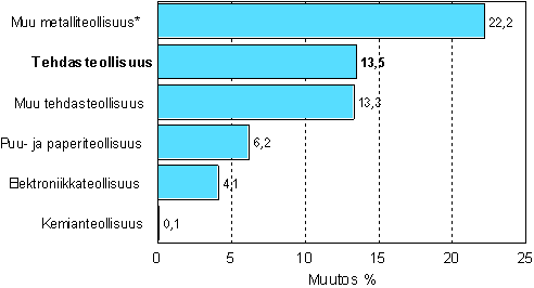 Tehdasteollisuuden varastojen arvo oli vuoden 2007 kesäkuun lopussa 13,5 prosenttia suurempi kuin vuotta aiemmin. Varastot kasvoivat kaikilla päätoimialoilla. Eniten kasvoivat muun metalliteollisuuden varastot runsaat 22 prosenttia. Puu- ja paperiteollisuuden varastot kasvoivat runsaat 6 prosenttia vuoden takaisesta. Elektroniikkateollisuuden varastot kasvoivat 4,1 prosenttia.