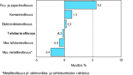 Tehdasteollisuuden varastojen arvo oli vuoden 2007 joulukuun lopussa 16,5 prosenttia suurempi kuin vuotta aiemmin. Varastot kasvoivat kaikilla päätoimialoilla. Eniten kasvoivat muun metalliteollisuuden varastot, 20 prosenttia. Puu- ja paperiteollisuuden varastot kasvoivat runsaat 16 prosenttia. Kemianteollisuuden varastot kasvoivat 15,4 prosenttia vuoden takaisesta. Vähiten kasvoivat muun tehdasteollisuuden varastot, 9,3 prosenttia.