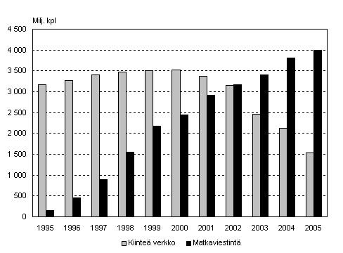 Puhelut: Paikallispuhelinverkosta soitettujen puheluiden määrä ja matkapuhelimista lähteneiden puheluiden määrä vuosina 1995-2005