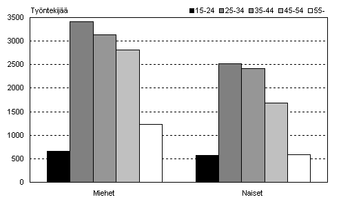 Tele, henkilöstö: Työntekijöiden ikärakenne teleliikenteen toimialalla (TOL 642) sukupuolen mukaan vuonna 2004*