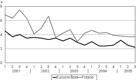 Förändring av kostnaderna per utförd arbetstimme i Finland och i euroområdet jämfört med motsvarande kvartal året innan 2000/I-2005/III, procent