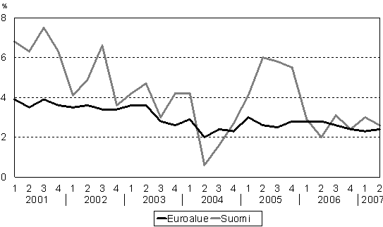 Tehdyn työtunnin kustannusten muutos Suomessa ja euroalueella edellisen vuoden vastaavasta neljänneksestä, I/2001 - II/2007, prosenttia
