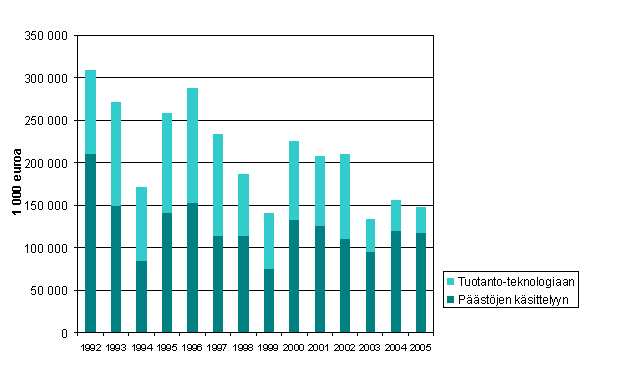 Kuvio 3. Investoinnit päästöjen käsittelyyn sekä puhtaampaan tuotantoteknologiaan vuosina 1992-2005 (tuhansia euroja)