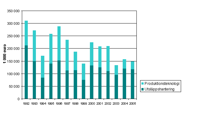 Figur 3. Investeringar i hanteringen av utsläpp samt i renare produktionsteknologi åren 1992-2005