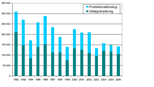 Figur 3. Investeringar i hanteringen av utsläpp samt i renare produktionsteknologi åren 1992-2006