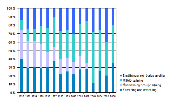 Figur 6. Övriga verksamhetsutgifter för miljövård efter användningsändamål åren 1992-2006