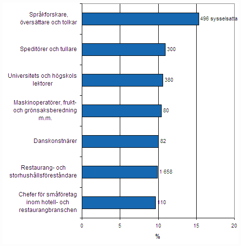 Andelen personer med utländsk bakgrund av de sysselsatta inom yrkesgrupperna var fortfarande relativt liten i uppgifterna för år 2006 år. Det berodde på att det fanns begränsningar för medborgarna i de stater som anslöt sig till EU år 2004 gällande inträde på arbetsmarknaden i Finland och att begränsningarna slopades först 30.4.2006. Yrkesgrupper där mer än 10 procent av de sysselsatta hade utländsk bakgrund var språkforskare, översättare och tolkar, speditörer och tullare, universitets- och högskolslektorer, maskinoperatörer, frukt- och grönsaksberedning samt danskonstnärer.